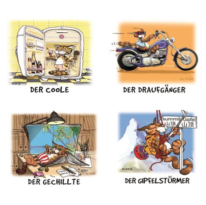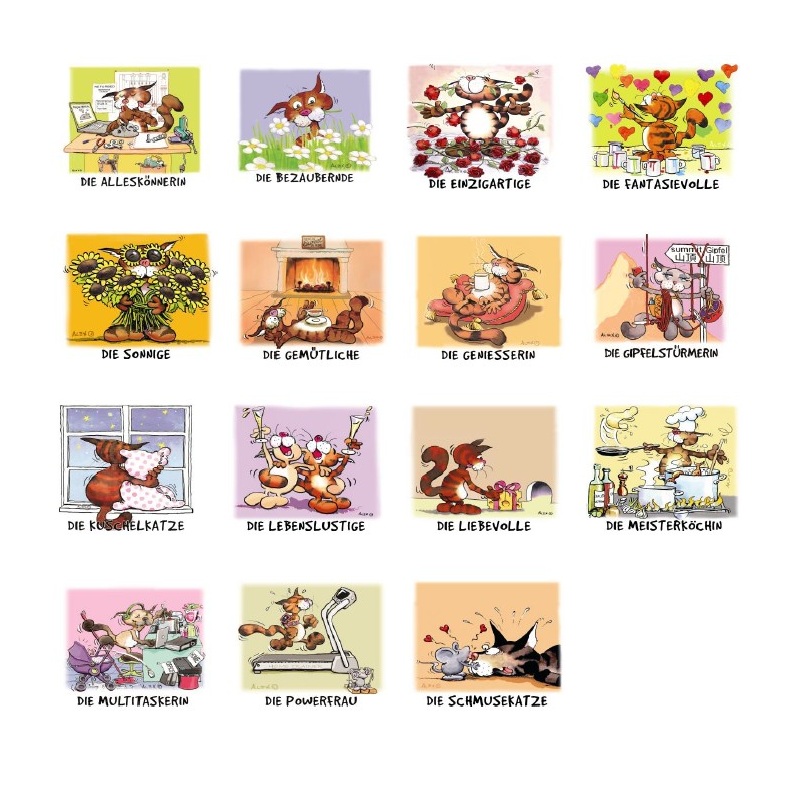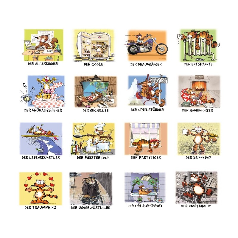 | Motive Untersetzer | DER ALLESKÖNNER, DER COOLE, DER DRAUFGÄNGER, DER ENTSPANNTE, DER FRÜHAUFSTEHER, DER GECHILLTE, DER GIPFELSTÜRMER, DER HOMEWORKER, DER LEBENSKÜNSTLER, DER MEISTERKOCH, DER PARTYTIGER, DER SUNNYBOY, DER TRAUMPRINZ, DER UNVERWÜSTLICHE, DER URLAUBSPROFI, DER WORKAHOLIC, DIE ALLESKÖNNERIN, DIE BEZAUBERNDE, DIE EINZIGARTIGE, DIE FANTASIEVOLLE, DIE GEMÜTLICHE, DIE GENIESSERIN, DIE GIPFELSTÜRMERIN, DIE KUSCHELKATZE, DIE LEBENSLUSTIGE, DIE LIEBEVOLLE, DIE MEISTERKÖCHIN, DIE MULTITASKERIN, DIE POWERFRAU, DIE SCHMUSEKATZE, DIE SONNIGE |